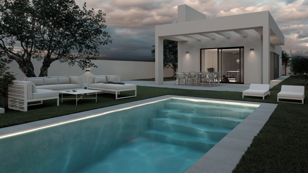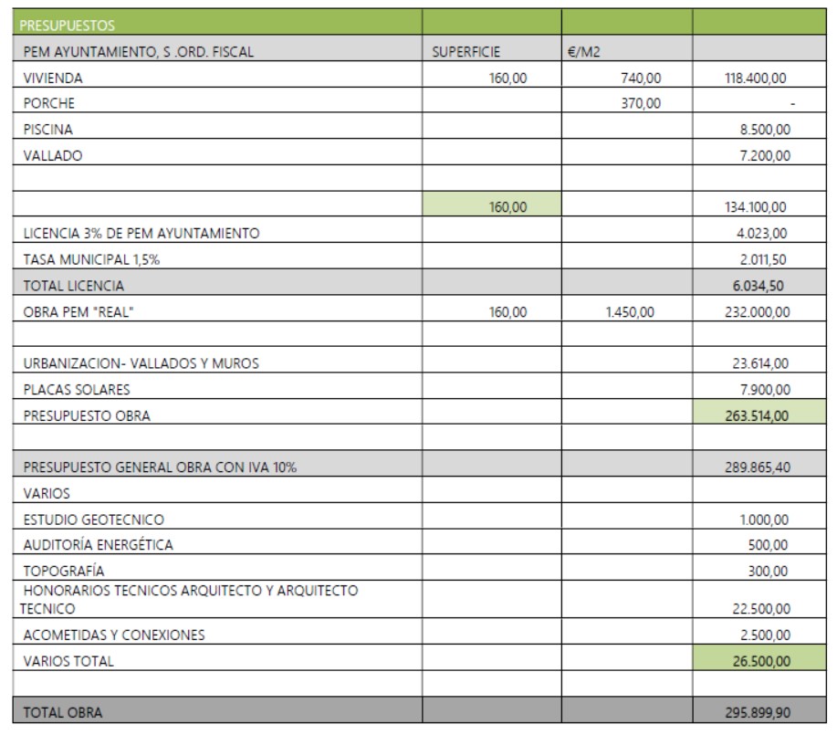 Faltaría introducir placas fotovoltaicas que podrían ser opcionales o instalarse más adelante. Se añade también un precio de acondicionamiento de la parcela (urbanización, piscina, vallados y muros)